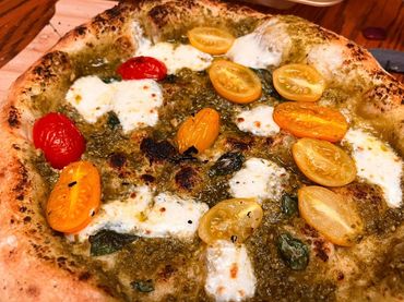 An enticing and aromatic pizza with a rich, basil pesto sauce as the base. Topped with creamy mozzarella, spinach, tomatoes, and Pecorino, this pizza is then baked to perfection. The fresh basil and earthy flavors of the pesto are complemented by a drizzle of extra virgin olive oil, creating a perfect harmony of tastes that will transport your taste buds to the heart of Italy.