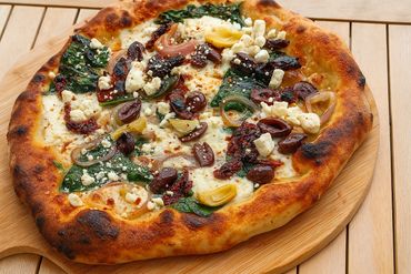 A Mediterranean-inspired delight packed with bold flavors. Loaded with fresh mozzarella, Kalamata olives, artichoke hearts, sun-dried tomatoes, red onions, and crisp green spinach, all laid over a garlic-infused olive oil base. Finished with a sprinkle of oregano and generously topped with Feta, this pizza brings a taste of Greece to every bite.