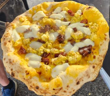 A golden, hand-stretched crust holds a creamy cheese sauce base, layered with crispy bacon, soft-baked eggs, and melty mozzarella. Finished with a pinch of sea salt and freshly cracked black pepper, the Buongiorno is a warm, savory start to your day—simple, satisfying, and straight from the oven.